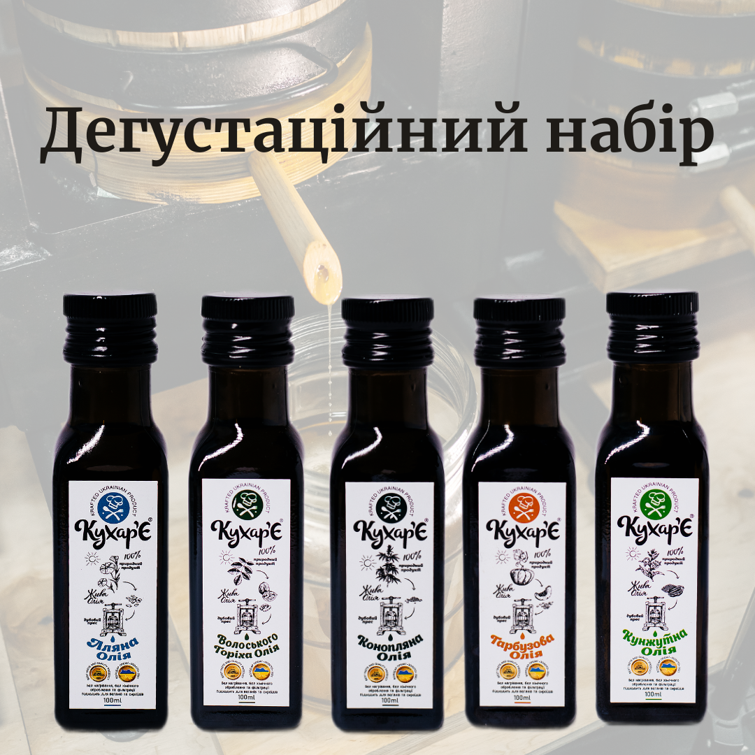 Кращий вибір для першого знайомства з сиродавленими оліями! Універсальний дегустаційний набір допоможе ознайомитися зі смаком олій та обрати для себе улюблені. Додавайте їх у салати, гарніри та смакуйте просто з хлібом.