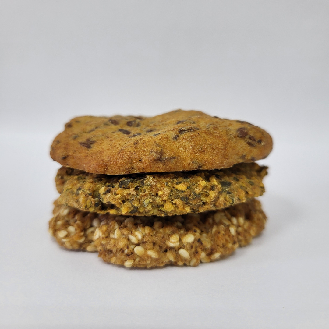 Склад: знежирене насіння (льону/гарбуза/кунжуту), цільнозернове борошно, масло Гхі, цукор, сіль, спеції, розпушувач.